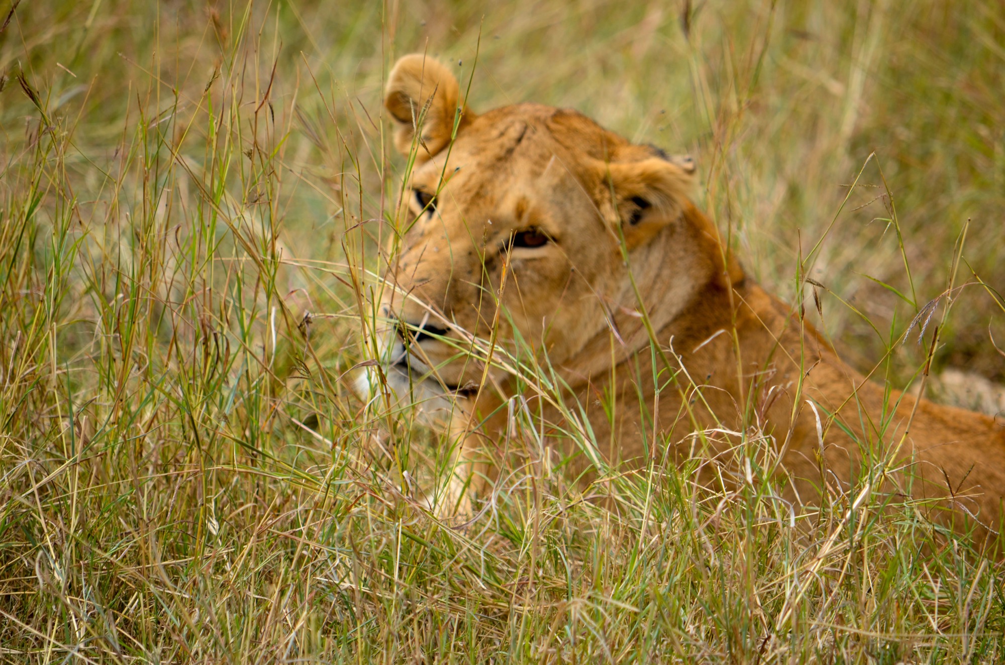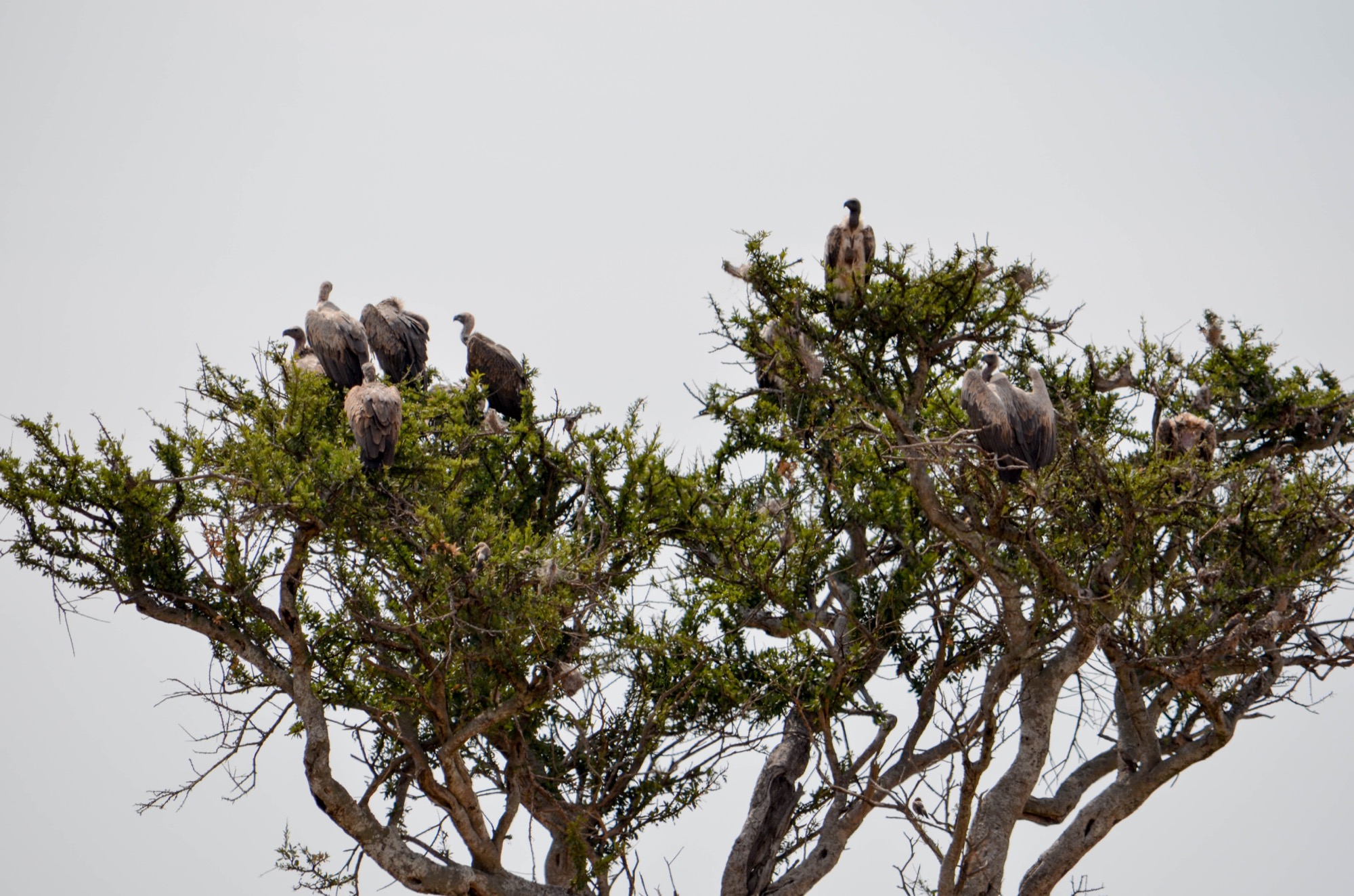 The lions blend in with the tall grasses and when they are laying down they are hard to spot. The vultures, however, provide a good clue as to where to look. These lions are guarding their kill and the vultures are waiting for the leftovers.