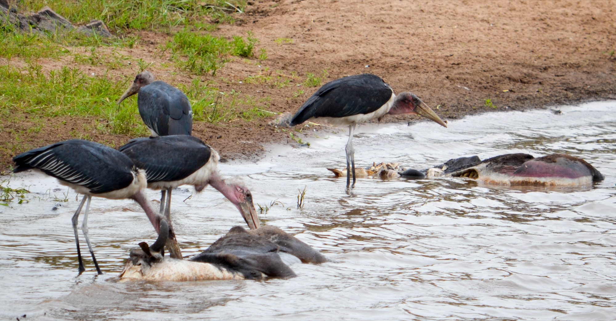 The vultures and marabou stork feast on the bloated bodies of the dead wildebeest. We also saw a monitor lizard enjoying the bounty.