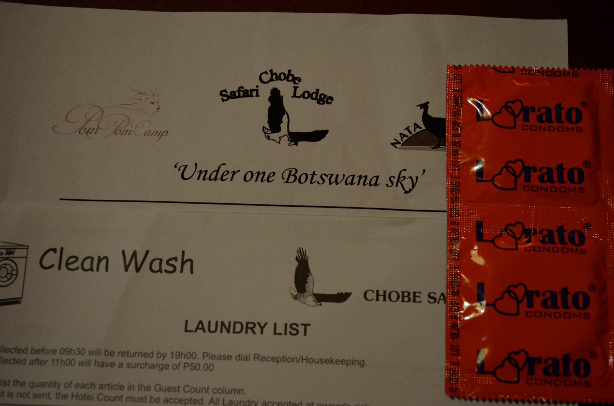 On the road we saw an interesting billboard. In addition, condoms were placed in the drawer at the hotel (next to the laundry list). In the US, we have bibles in hotel drawers. Guess in Botswana they have figured out that perhaps condoms work better than prayers in this circumstance.