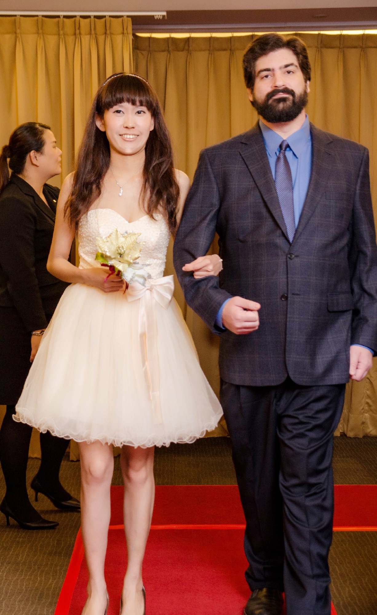 First Tina and Ryan walked down the aisle, followed by Robin and Steve. Then Kevin came in with Sho-ching and stopped half way down the aisle. Nina appeared with her father, Ray-yu. There was bowing and hugging and Kevin and Nina finished walking down the aisle together.