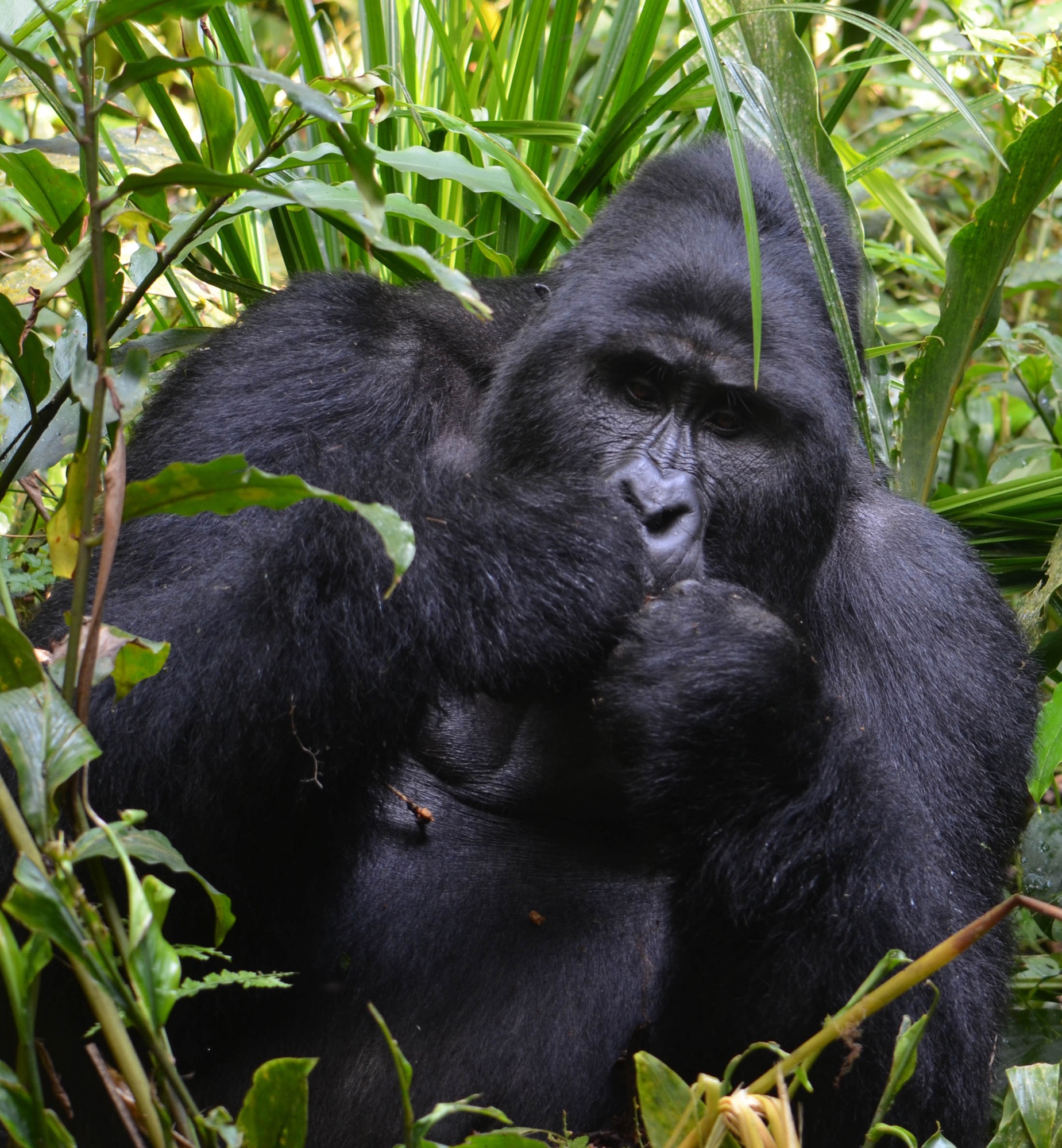 The silverback for this particular family tended to be somewhat skittish and aggressive. At one point he rushed forward, waving his fists and shrieking. The guide told us not to move and the gorilla stopped short before reaching our group. The silverback then called to his family and they began to move to a different location. Our guide took out the machete, opened up a path, and we followed.