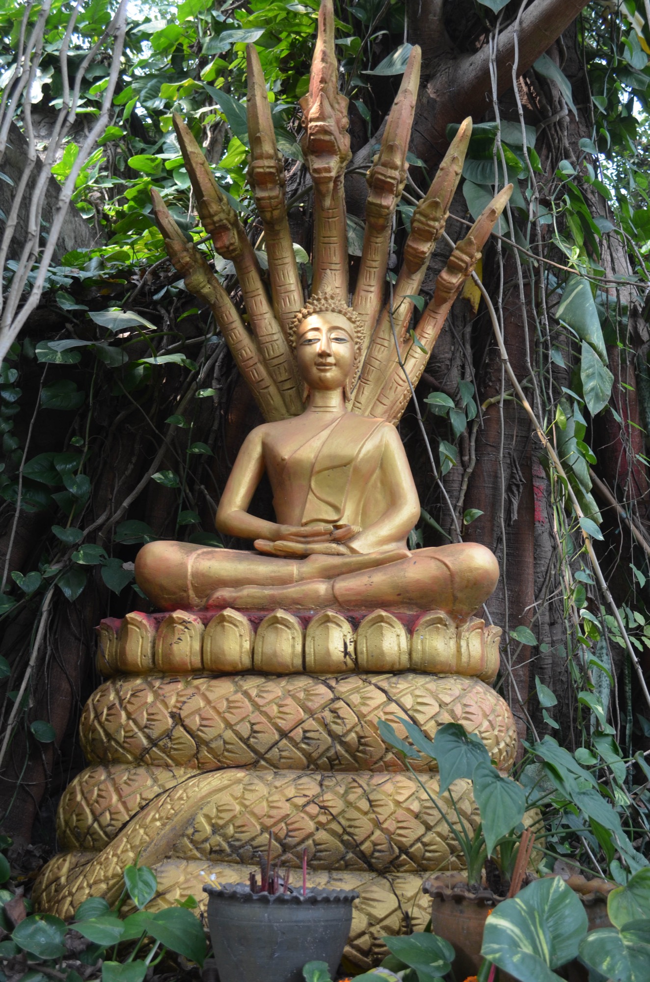 The climb down the back side of Phousi Hill is 355 steps and winds through an area with many small shrines and statues. Many of the golden statues were built in to alcoves in the rock and gave the appearance of having just grown there.