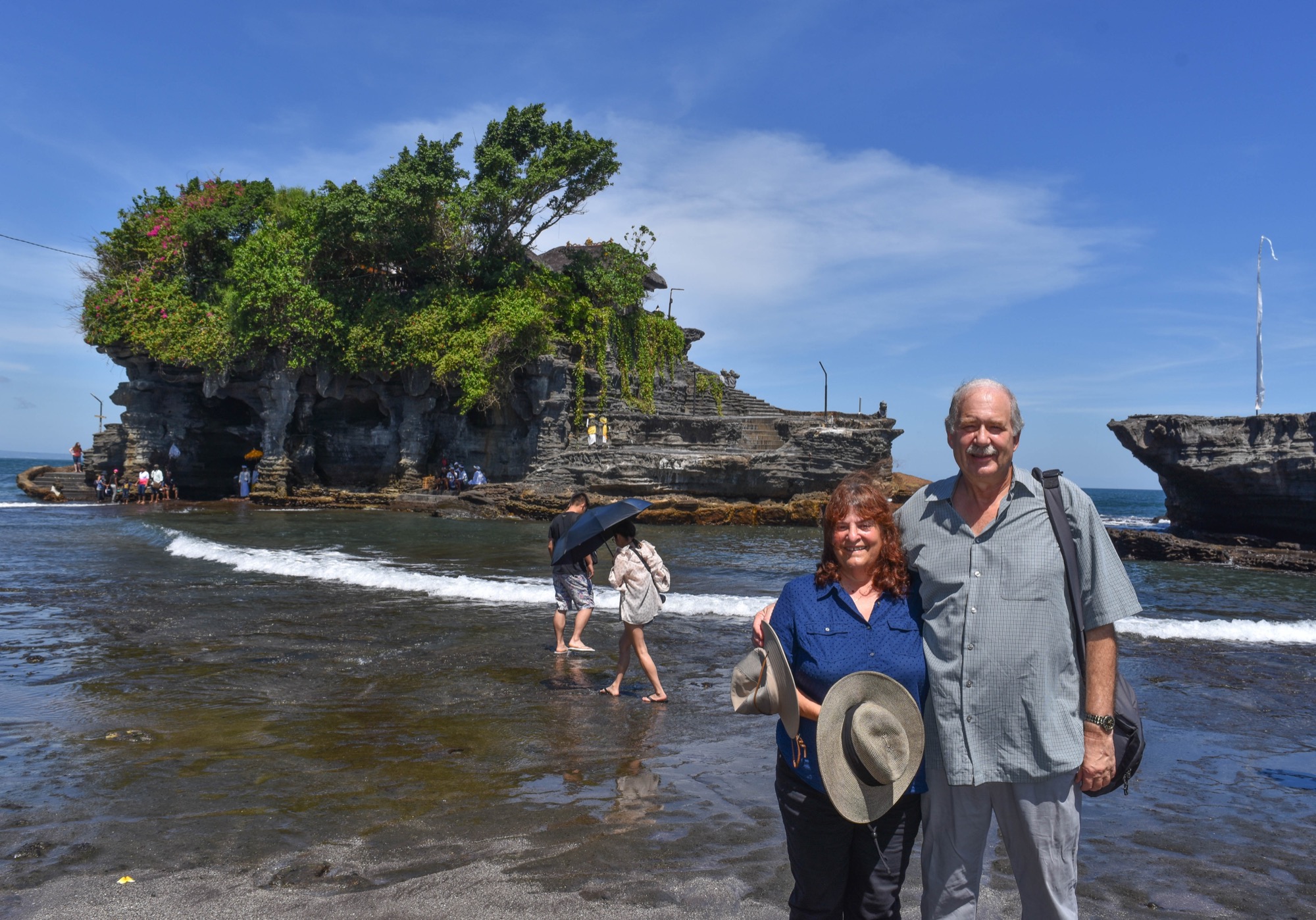 We spent a delightful morning exploring two ocean temples with breathtaking locations. One temple, Pura Batu Bolong, sits atop a small rocky peninsula with a sea arch formed by the erosional forces of the waves.