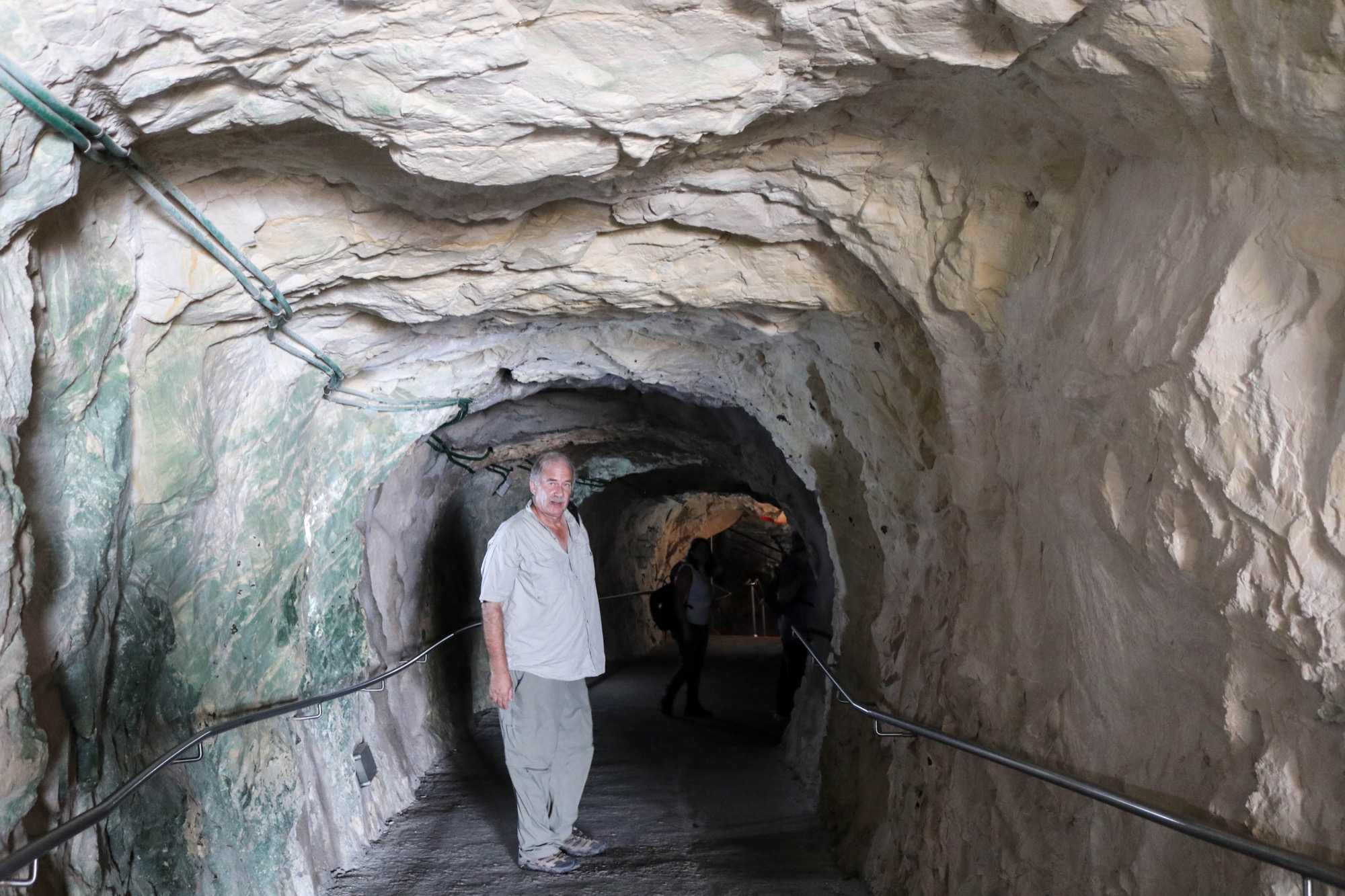 The cable cars at Rosh Hanikra, which have the distinction of being the steepest in the world, take visitors down from the cliff above to the sea grottoes below. The grottoes, which are a series of beautiful caves and tunnels, were formed by the action of the ocean wearing away the soft chalk rock. Rosh Hanikra is on Israel's Mediterranean coast near the border of Lebanon.