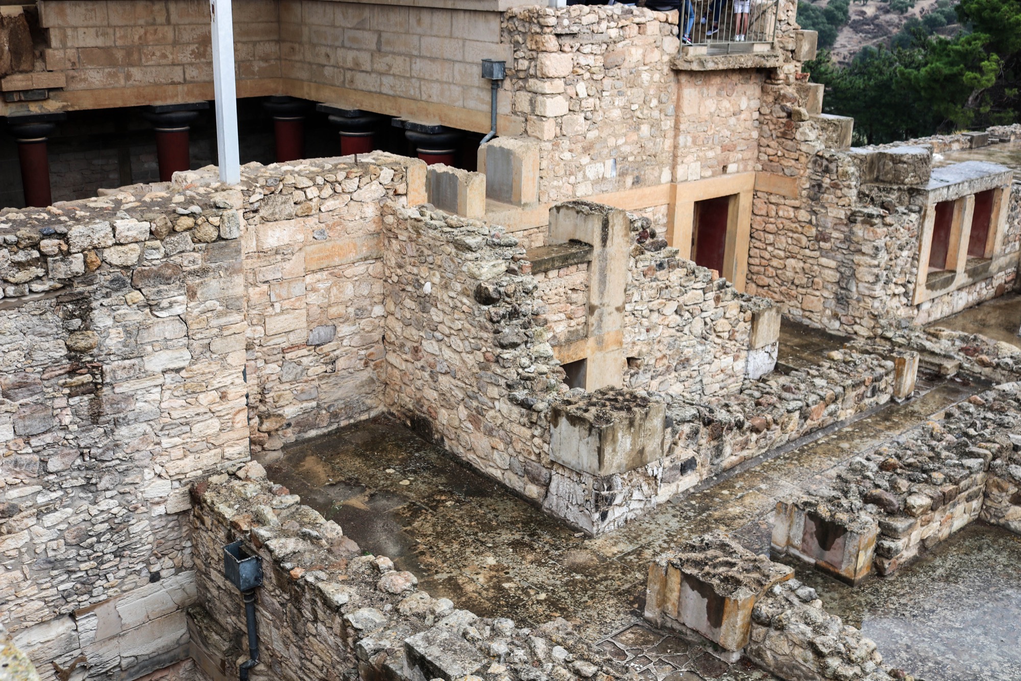One of the rooms uncovered during the excavation at Knossos was the throne room. There is a throne against the north wall, made of alabaster, and gypsum benches line the other three walls. On one wall is a fresco which has a couple of griffins.