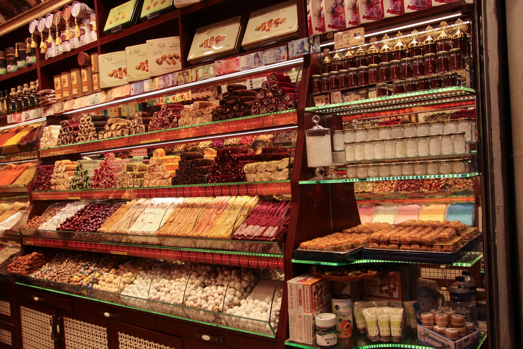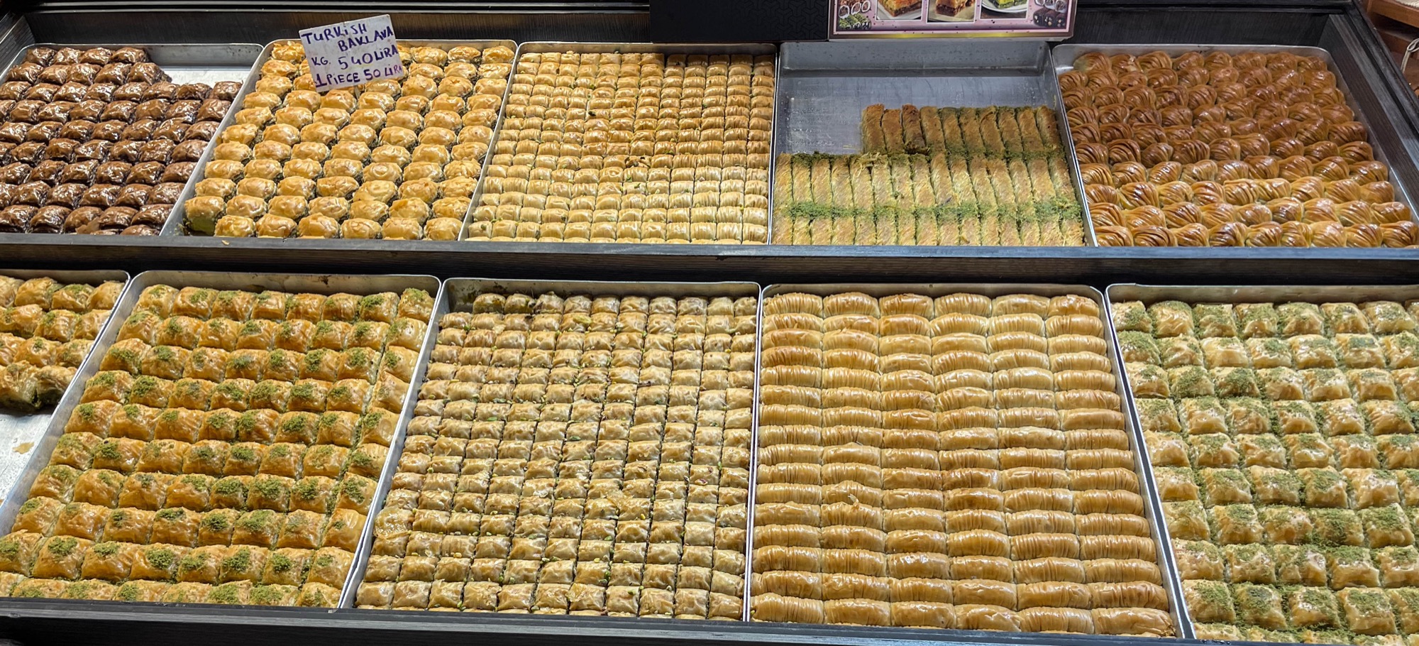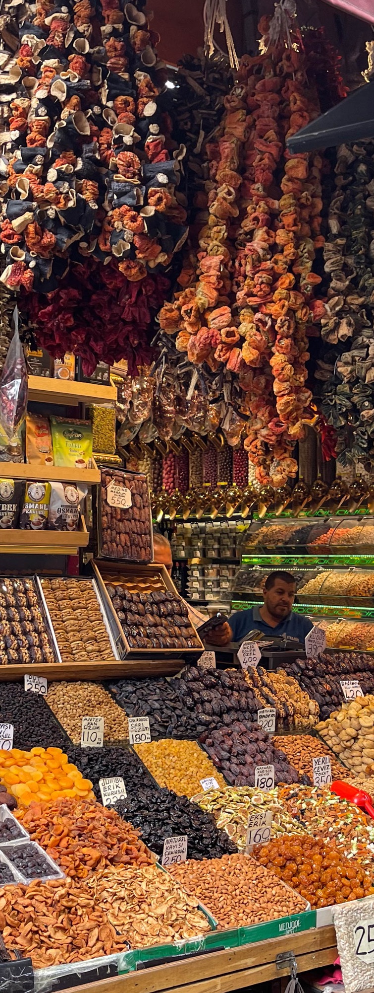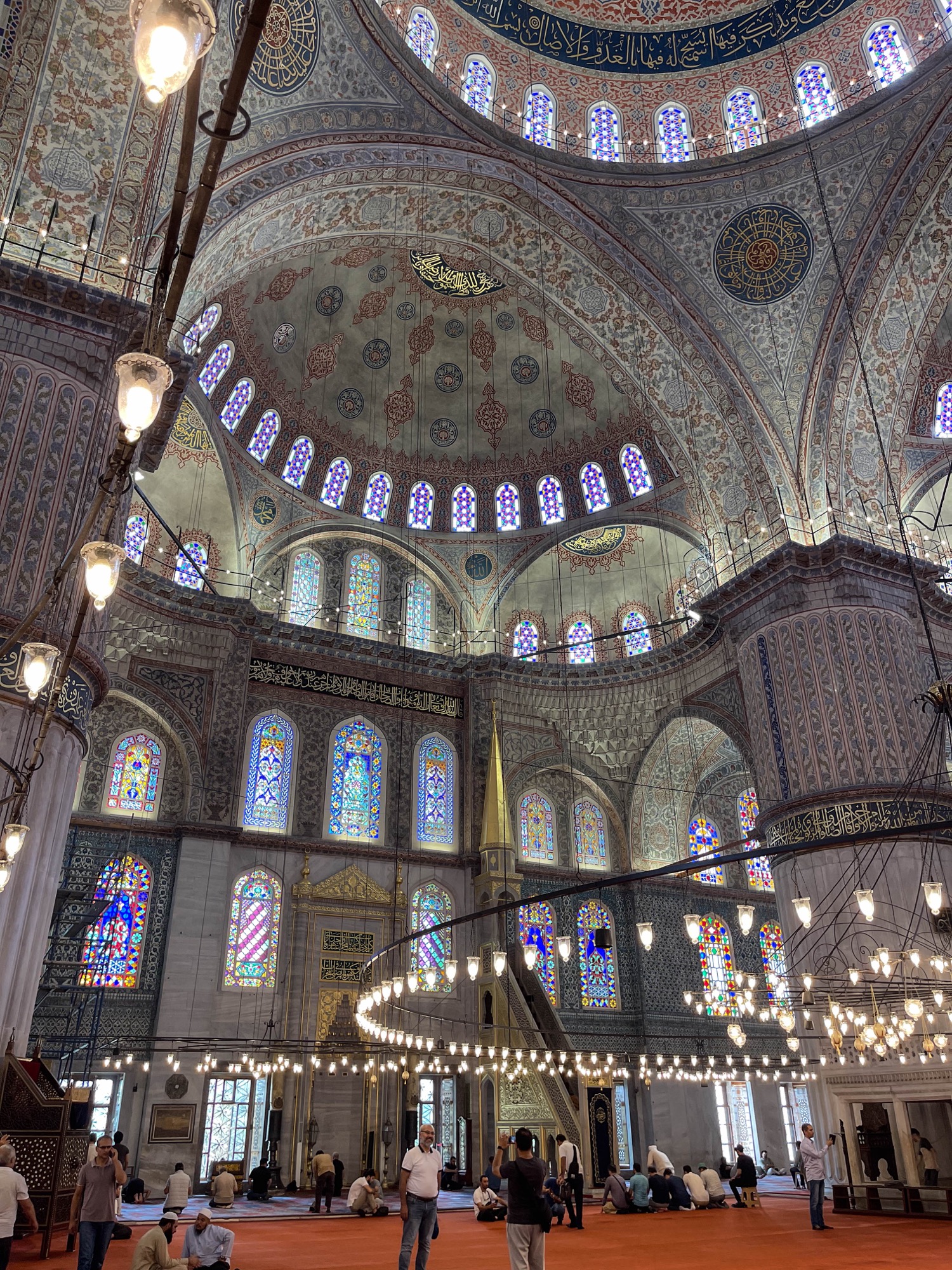 The Blue Mosque was so named because the Iznik tiles are primarily blue in color. The designs on the tiles feature cypress trees, fruits, roses, and more than fifty different designs with tulips. It is interesting to note that there are several ostrich eggs hanging in the chandeliers at the mosque. The purpose of the eggs is to repel spiders so there are no cobwebs on the chandeliers.